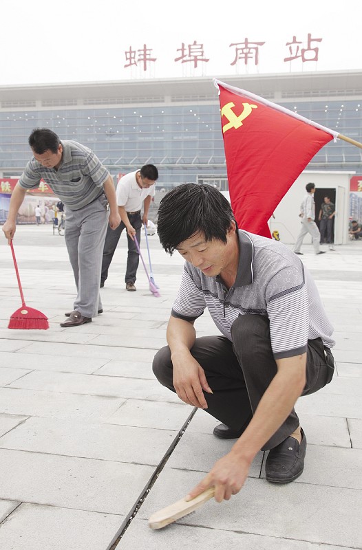 6月25日上午,為慶祝中國(guó)共產(chǎn)黨建黨90周年暨京滬高鐵開通,蚌投集團(tuán)黨委組織集團(tuán)本部及所屬19個(gè)子公司共計(jì)198名黨員去高鐵蚌埠南站義務(wù)勞動(dòng),清理南站廣場(chǎng)建筑垃圾并清掃地面,為高鐵通車做出一個(gè)黨員力所能及的貢獻(xiàn)。